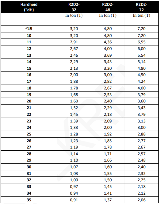| Regeneratie capaciteit (CAP. REG.) | R2D2-32 = 1,45T R2D2-48 = 2,10T R2D2-72 = 3,20T |