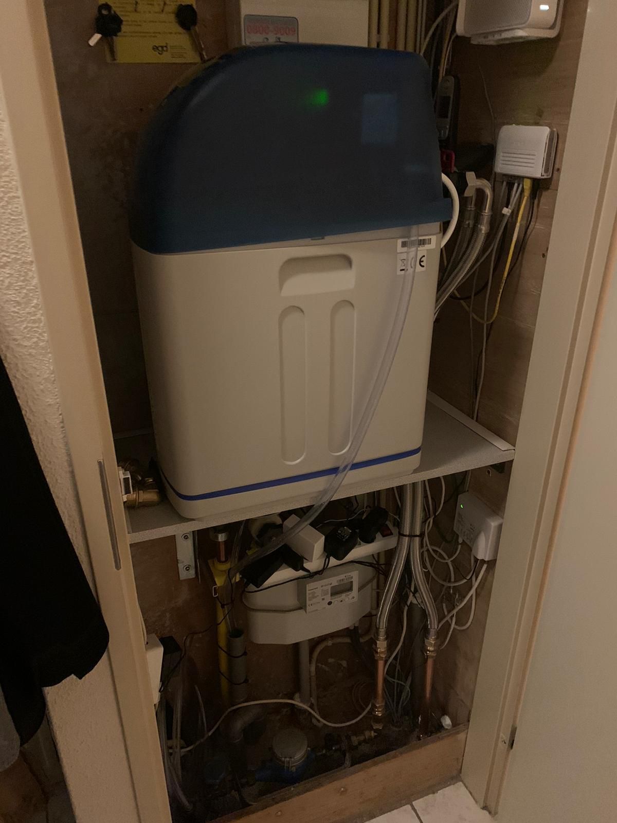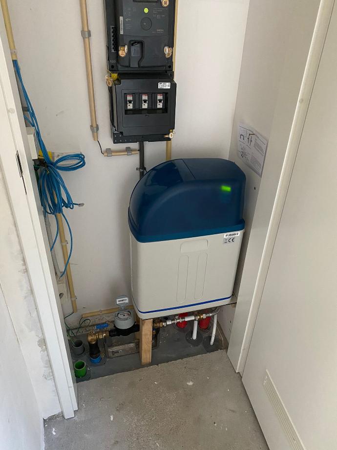 Plaats de waterontharder voor de eerste afsplitsing maar na de watermeter