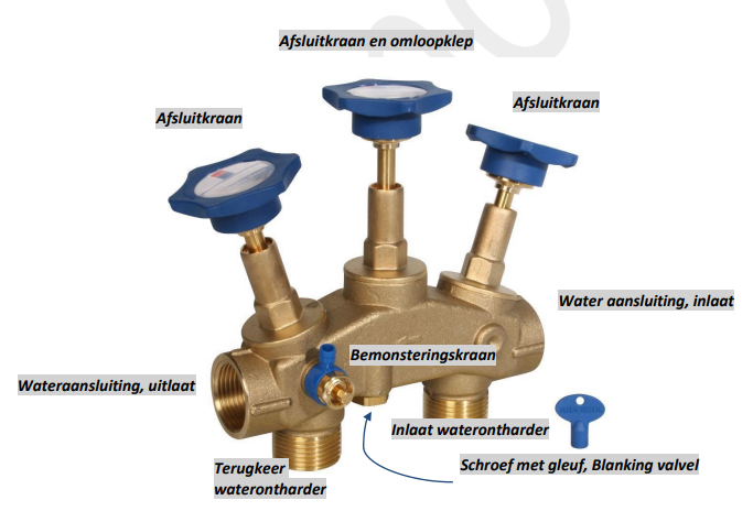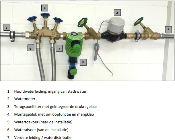 Dit is hoe een volledige aansluiting van je waterontharder aan je waterleiding eruit kan zien. In dit voorbeeld is een terugspoelfilter met drukregelaar geplaatst . Dit is in Nederland vrijwel niet nodig door ons kwalitatief goede drinkwater. Een drukregelaar is alleen nodig wanneer uw druk niet tussen de 2-6 bar is. Ten tweede ziet u een montageblok. Met het montageblok kunt u het water langs de waterontharder laten lopen in het geval dat u hard water wilt gebruiken (tuin of zwembad) of wanneer het apparaat onverhoopt defect gaat.
